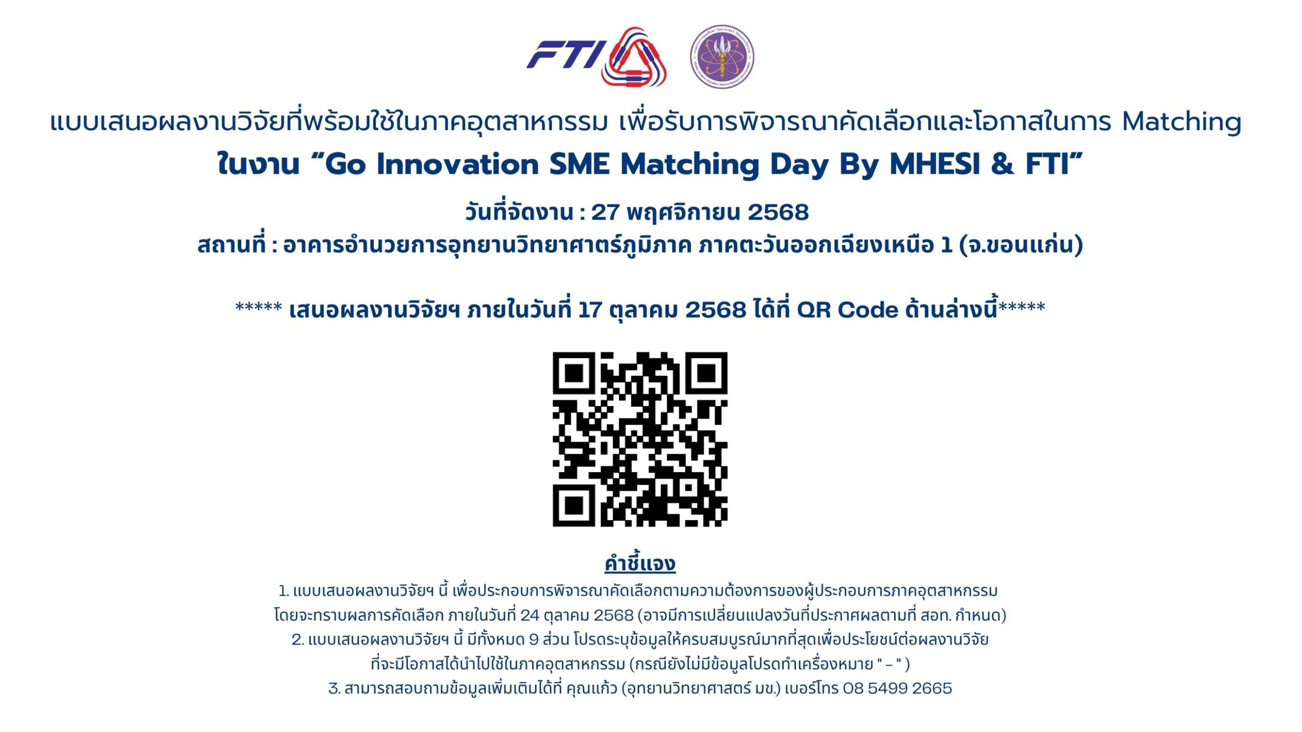 ประชาสัมพันธ์ร่วมเสนอผลงานวิจัยที่พร้อมใช้และตรงกับความต้องการของผู้ประกอบการภาคอุตสาหกรรม ประกอบด้วย ด้านเกษตรและอาหาร สมุนไพรและสุขภาพ ข้าว ไหมและฝ้าย ไผ่ ผลิตภัณฑ์จากปลา (เช่น ปลาร้า ปลาส้ม เป็นต้น) และเห็ด เพื่อรับการพิจารณาคัดเลือกผลงานวิจัยต่อไป โดยสามารถกรอกข้อมูลตามลิ้งนี้ https://forms.gle/DCEhyjWpZpSo8XtY7 หรือที่ QR Code ภายในวันศุกร์ที่ 17 ตุลาคม 2568 นี้
