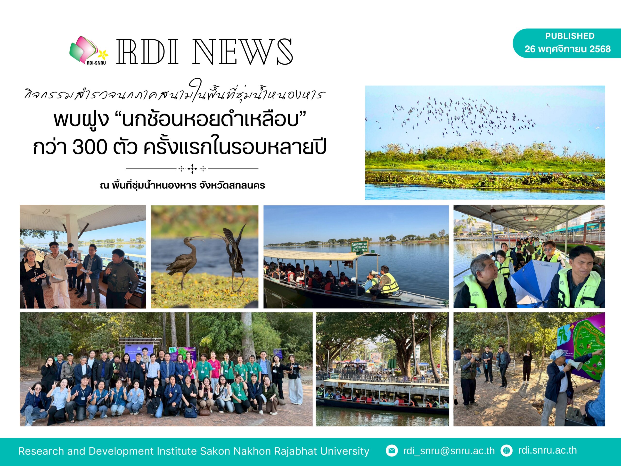 เมื่อวันที่ 24 พฤศจิกายน 2568 สถาบันวิจัยแลพัฒนา มหาวิทยาลัยราชภัฏสกลนคร ร่วมกับ มหาวิทยาลัยดานัง (UED) ประเทศเวียดนาม พร้อมด้วยภาคีเครือข่ายทั้งภาครัฐ ภาคประชาสังคม และชมรมอนุรักษ์นกสกลนคร ได้จัดกิจกรรมลงพื้นที่สำรวจนกภาคสนามในพื้นที่ชุ่มน้ำหนองหาร จังหวัดสกลนคร
