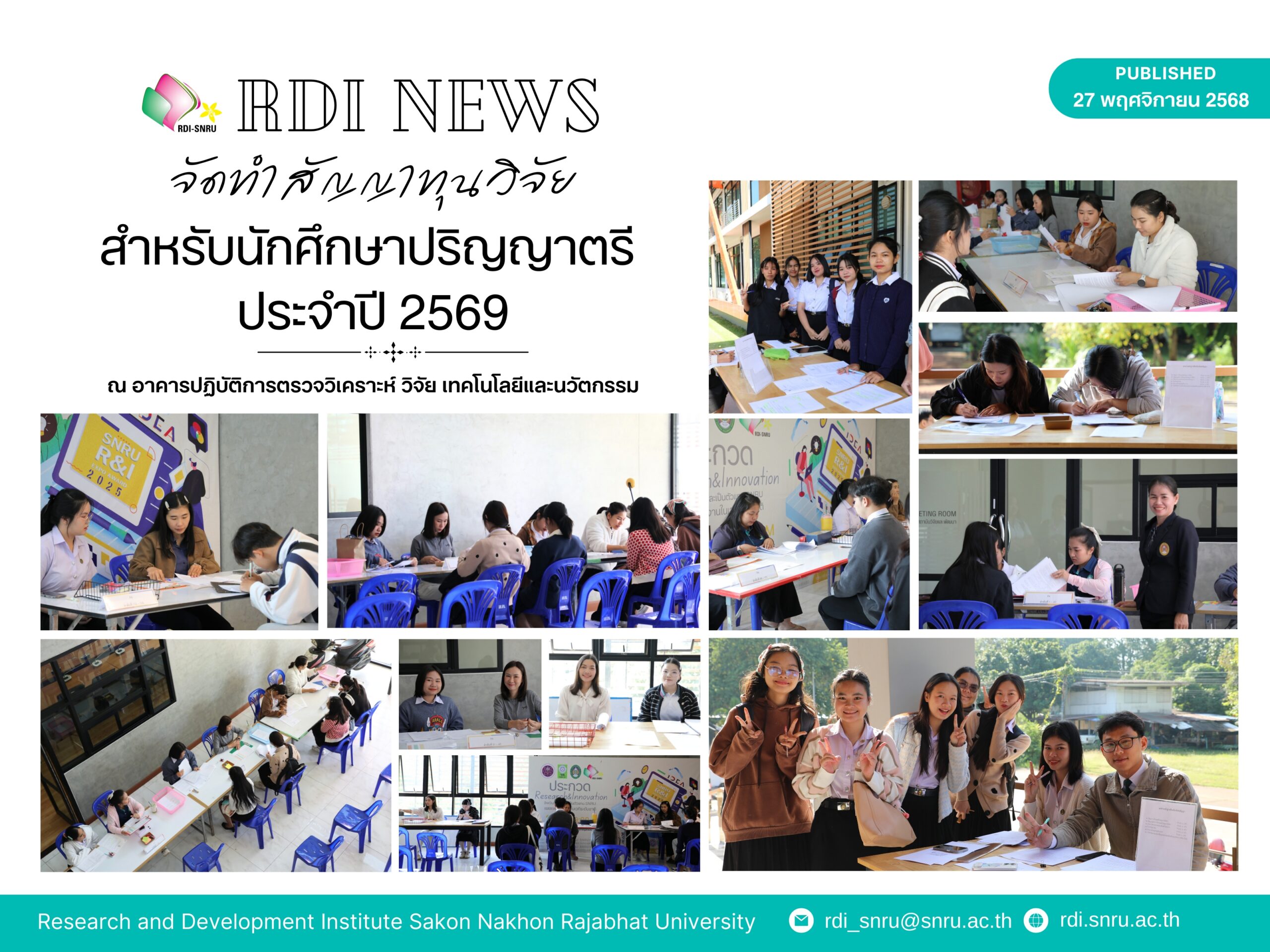 งานบริหารการวิจัยและนวัตกรรม สถาบันวิจัยและพัฒนา มหาวิทยาลัยราชภัฏสกลนคร ได้ดำเนินการจัดทำสัญญาทุนสนับสนุนการวิจัยและพัฒนา สำหรับนักศึกษาระดับปริญญาตรี (ภาคปกติ) จากงบประมาณเงินรายได้ ประจำปีงบประมาณ พ.ศ. 2569 รวมจำนวน 128 โครงการ