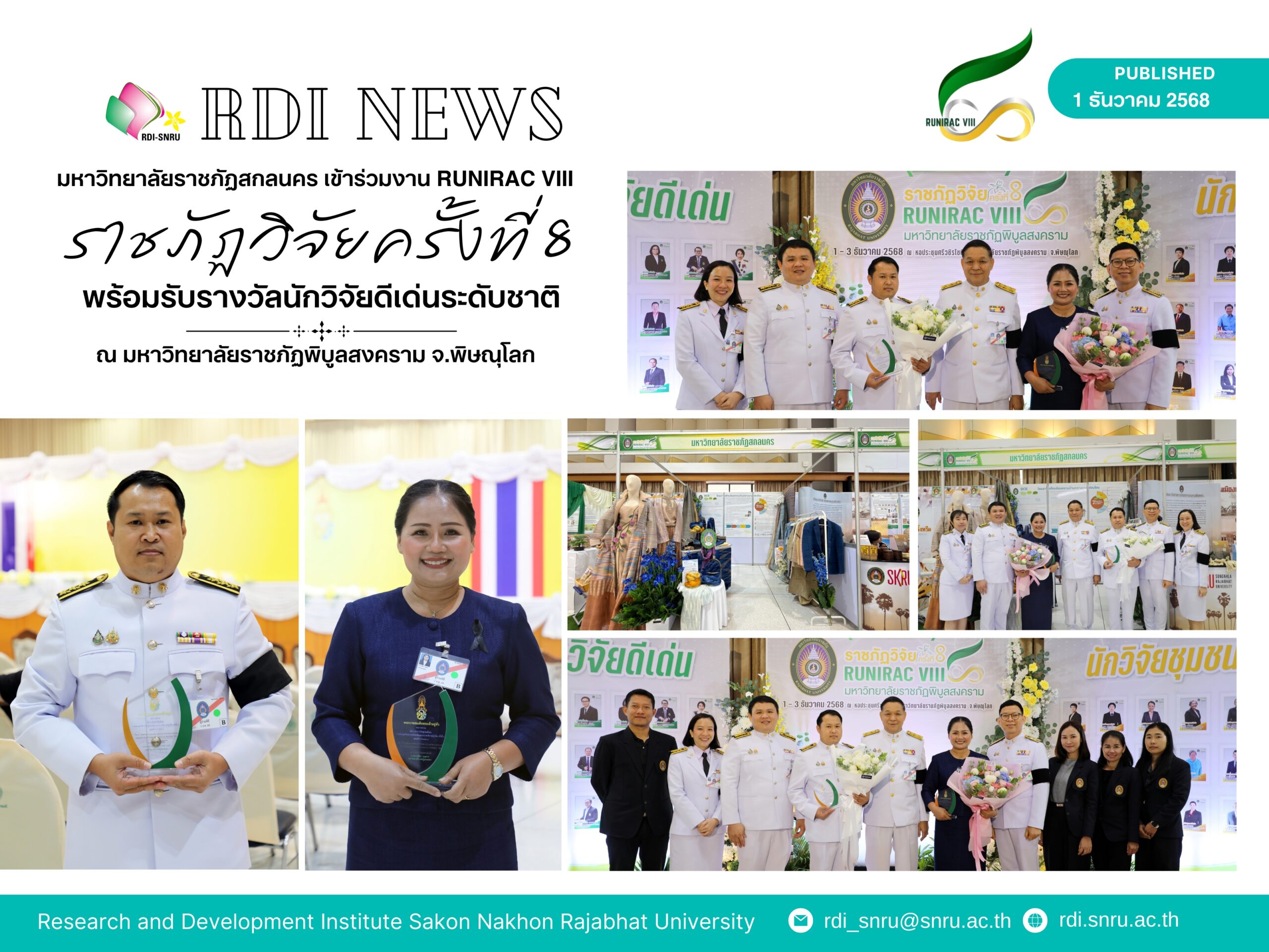 มหาวิทยาลัยราชภัฏสกลนคร โดย ผศ.ชาคริต ชาญชิตปรีชา อธิการบดี พร้อมด้วยผู้บริหาร และบุคลากรสถาบันวิจัยและพัฒนา เข้าร่วมประชุมวิชาการระดับชาติและนานาชาติ “ราชภัฏวิจัย ครั้งที่ 8” (The 8th Rajabhat University National and International Research and Academic Conference: RUNIRAC VIII) ในวันที่ 1 – 3 ธันวาคม 2568 ณ มหาวิทยาลัยราชภัฏพิบูลสงคราม จังหวัดพิษณุโลก โดยพันเอก หม่อมเจ้านวพรรษ์ ยุคล ผู้แทนพระองค์ เป็นประธานในพิธีเปิด และมอบรางวัลโล่พระราชทาน รางวัลนักวิจัยดีแด่น และรางวัลนักวิจัยชุมชนดีเด่น จากมหาวิทยาลัยราชภัฏ 38 แห่ง