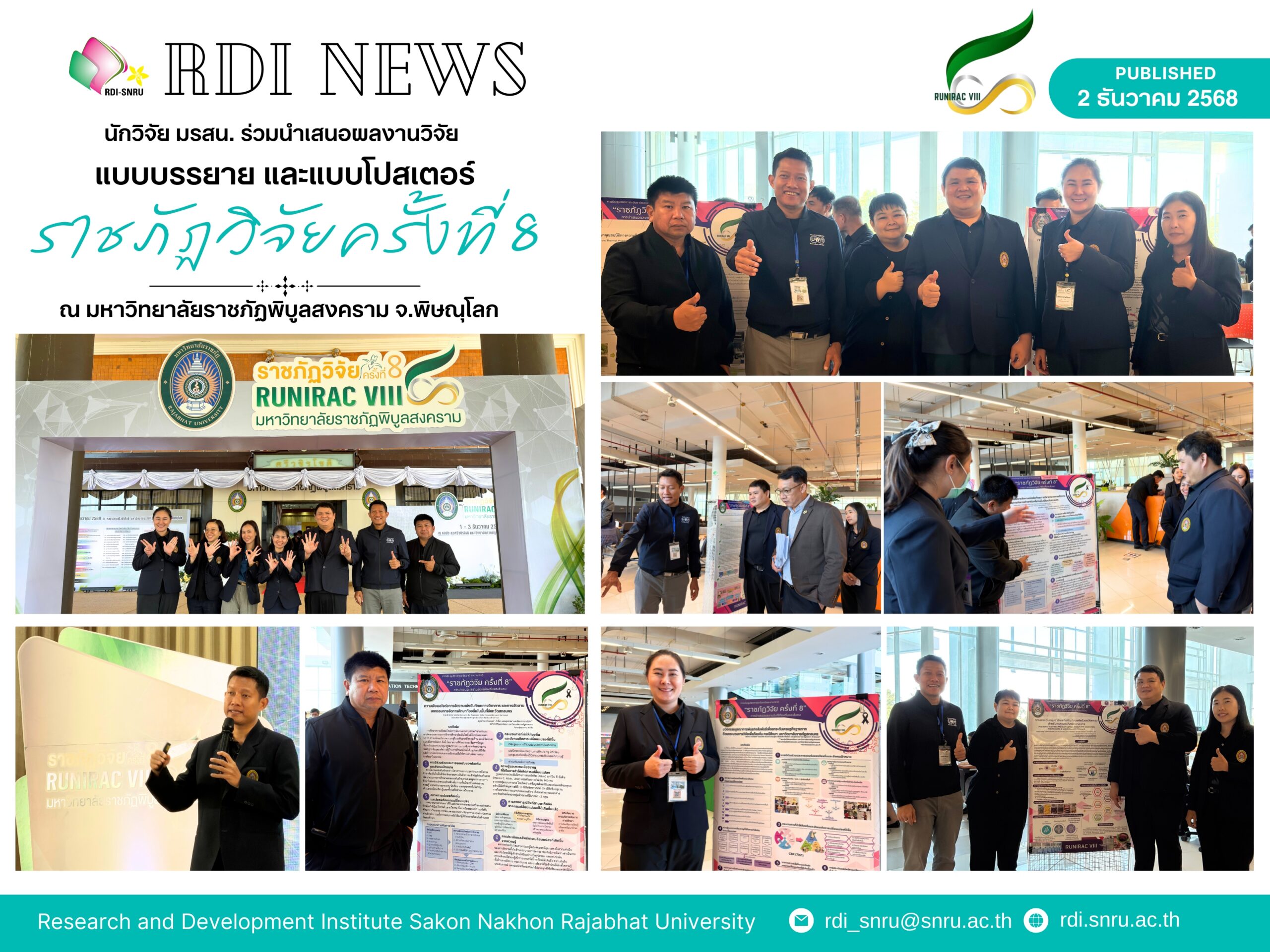 บุคลากรสถาบันวิจัยและพัฒนา มหาวิทยาลัยราชภัฏสกลนคร เข้าร่วมงานประชุมวิชาการระดับชาติและนานาชาติ “ราชภัฏวิจัย ครั้งที่ ๘” (The 8th Rajabhat University National and International Research and Academic Conference: RUNIRAC VIII) ระหว่างวันที่ 1–3 ธันวาคม พ.ศ. 2568 ณ มหาวิทยาลัยราชภัฏพิบูลสงคราม จังหวัดพิษณุโลก โดยนักวิจัยได้นำเสนอผลงานวิจัยทั้งในรูปแบบบรรยายและแบบโปสเตอร์ รวมทั้งสิ้น 4 ผลงาน แบ่งเป็นผลงานในระดับนานาชาติ และผลงานด้านการรับใช้ท้องถิ่นและสังคม ดังนี้