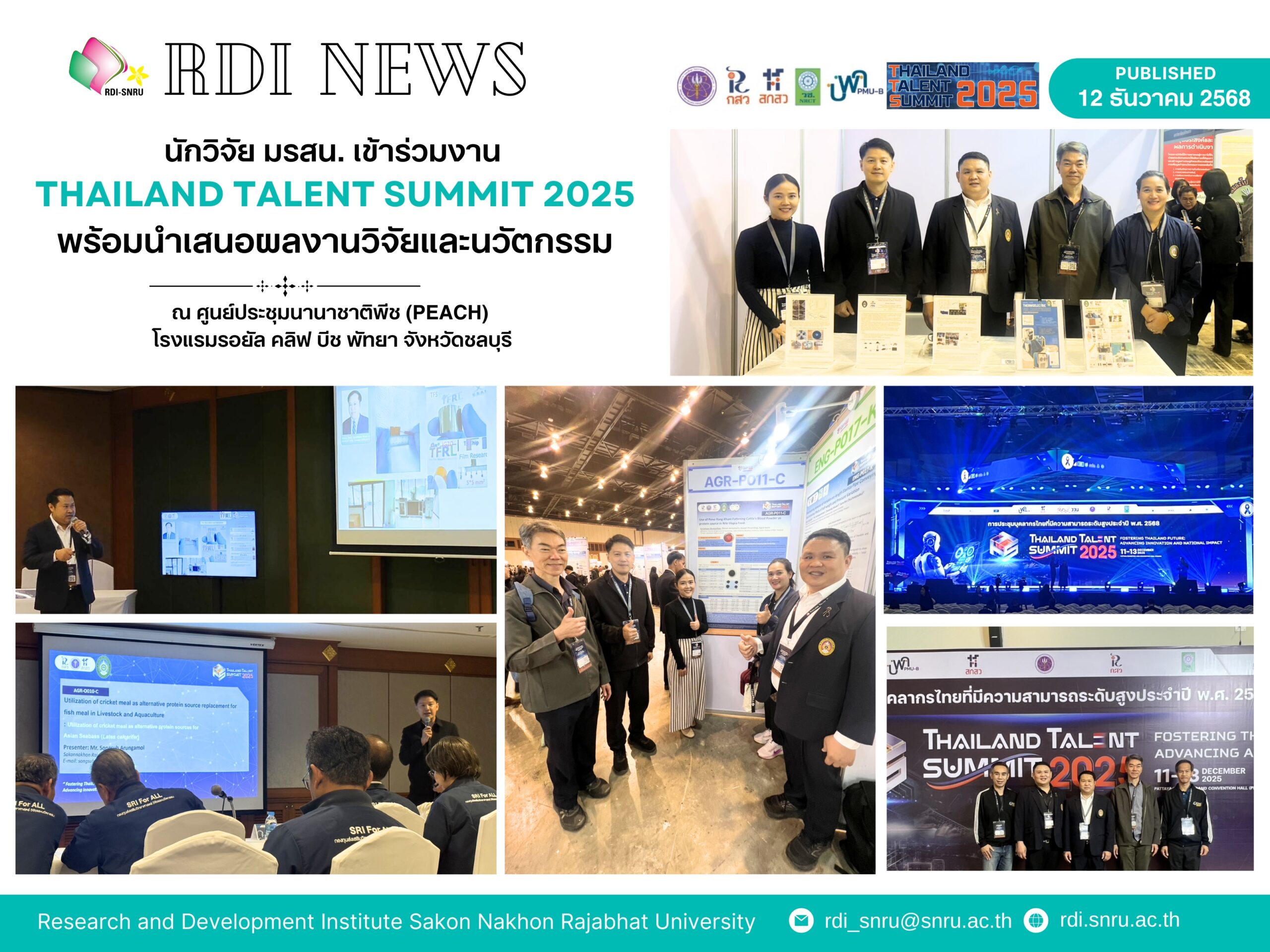 สถาบันวิจัยและพัฒนา มหาวิทยาลัยราชภัฏสกลนคร เข้าร่วมงาน “การประชุมบุคลากรไทยที่มีความสามารถระดับสูง ประจำปี พ.ศ. 2568 (Thailand Talent Summit 2025)” จัดโดยสำนักงานคณะกรรมการส่งเสริมวิทยาศาสตร์ วิจัยและนวัตกรรม (สกสว.) ระหว่างวันที่ 11–13 ธันวาคม พ.ศ. 2568 ณ ศูนย์ประชุมนานาชาติพีช (PEACH) โรงแรมรอยัล คลิฟ บีช พัทยา จังหวัดชลบุรี