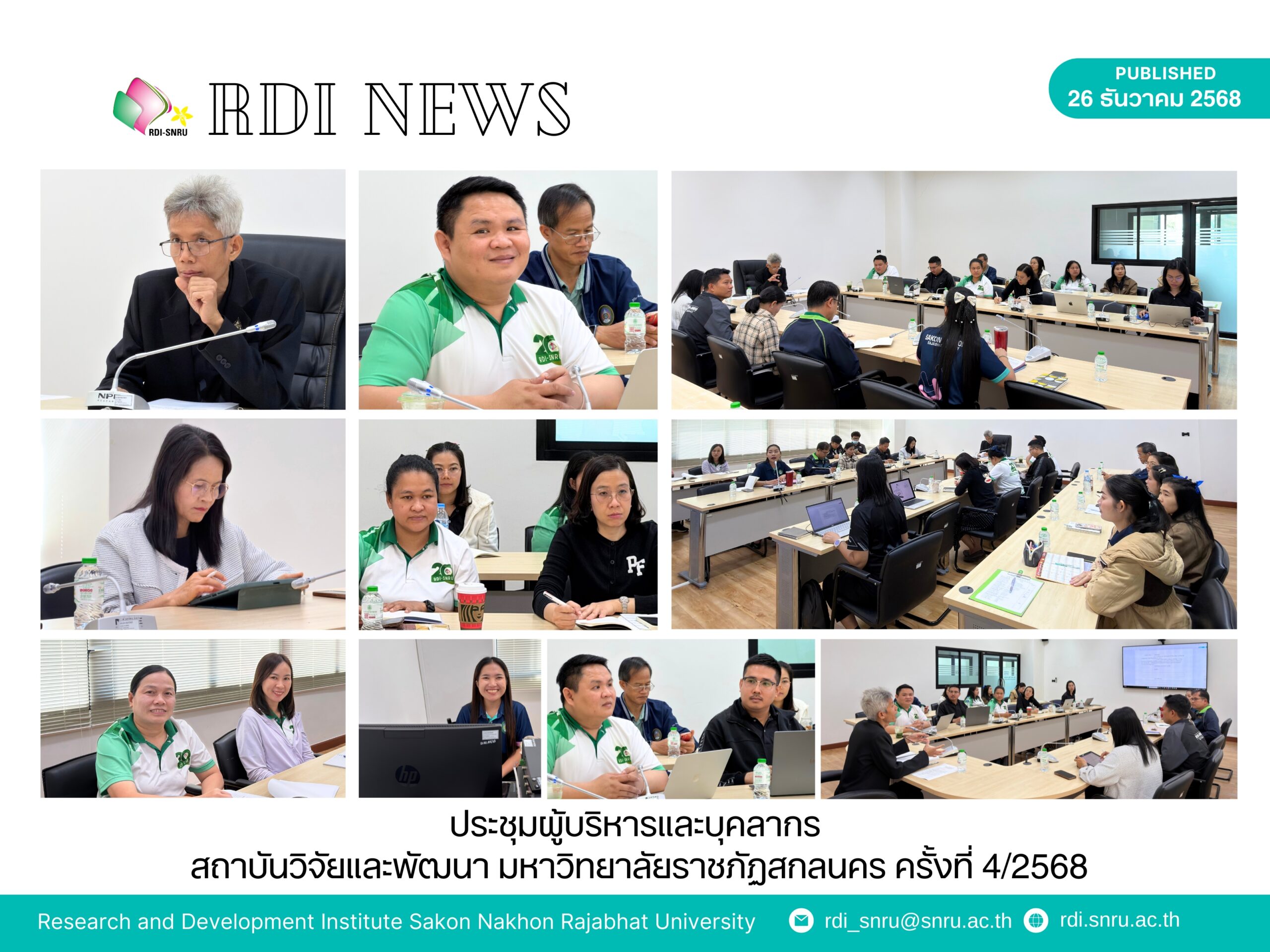 เมื่อวันที่ 26 ธันวาคม 2568 สถาบันวิจัยและพัฒนา มหาวิทยาลัยราชภัฏสกลนคร นำโดย ผศ.ปรีชาศาสตร์ มีเกาะ รองอธิการบดี เป็นประธานการประชุมผู้บริหารและบุคลากร ครั้งที่ 4/2568 ณ ห้องประชุมสถาบันวิจัยและพัฒนา ชั้น 2 อาคารปฏิบัติการตรวจวิเคราะห์วิจัย เทคโนโลยี และนวัตกรรม การประชุมมีวัตถุประสงค์เพื่อ รายงานผลการดำเนินงานที่ผ่านมา และ วางแนวทางการพัฒนางานวิจัยและการบริหารจัดการองค์กร ให้มีประสิทธิภาพมากยิ่งขึ้น โดยมีการนำเสนอวาระสำคัญต่าง ๆ เพื่อใช้เป็นแนวทางในการขับเคลื่อนภารกิจของสถาบันฯ ให้สอดคล้องกับยุทธศาสตร์การพัฒนามหาวิทยาลัย