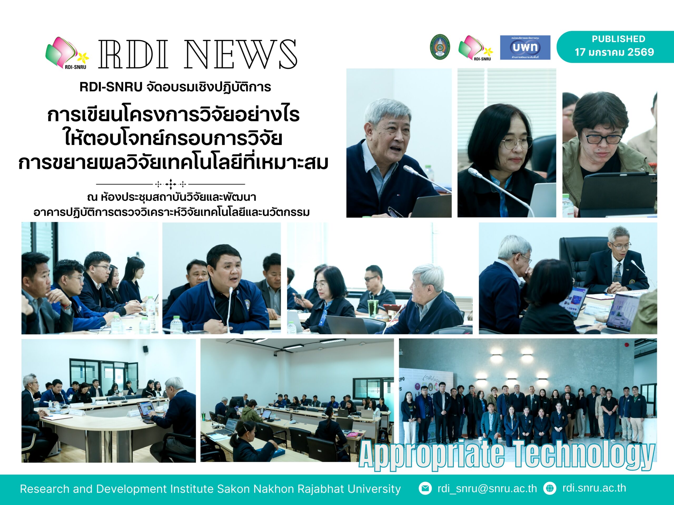 วันที่ 17 มกราคม พ.ศ. 2569 สถาบันวิจัยและพัฒนา มหาวิทยาลัยราชภัฏสกลนคร จัดอบรมเชิงปฏิบัติการ เรื่อง “การเขียนโครงการวิจัยให้ตอบโจทย์กรอบการวิจัยและการขยายผลเทคโนโลยีที่เหมาะสม (Appropriate Technology) เพื่อยกระดับรายได้ครัวเรือนและเศรษฐกิจฐานราก” ประจำปีงบประมาณ 2569