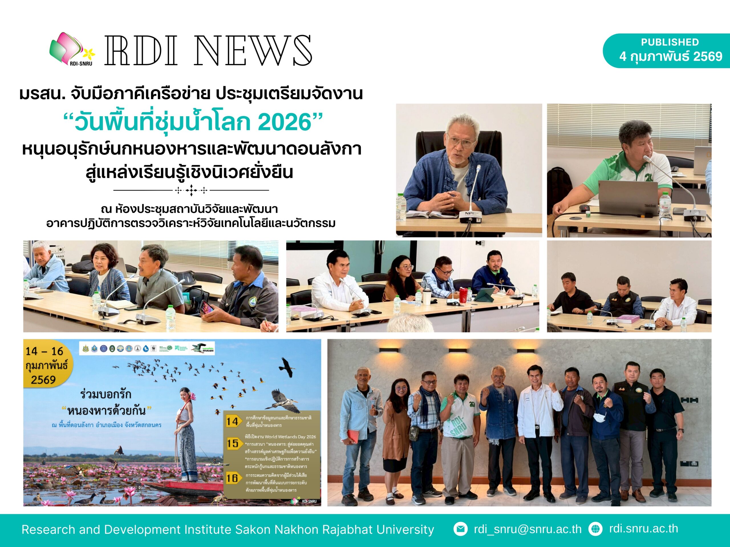 สถาบันวิจัยและพัฒนา มหาวิทยาลัยราชภัฏสกลนคร ร่วมกับองค์การบริหารส่วนจังหวัดสกลนคร ทรัพยากรธรรมชาติและสิ่งแวดล้อมจังหวัดสกลนคร สภาอุตสาหกรรมการท่องเที่ยวจังหวัดสกลนคร สมาคมส่งเสริมการพัฒนาลุ่มน้ำอย่างยั่งยืน และชมรมอนุรักษ์นกและธรรมชาติสกลนคร จัดประชุมเตรียมความพร้อมในการจัดงาน วันพื้นที่ชุ่มน้ำโลก (World Wetlands Day 2026) ภายใต้โครงการ “พัฒนาศูนย์การเรียนรู้ชุมชนต้นแบบการจัดการทรัพยากรนกและธรรมชาติโดยชุมชน สู่แหล่งเรียนรู้และการท่องเที่ยวเชิงนิเวศพื้นที่ดอนลังกา หนองหาร จังหวัดสกลนคร” ซึ่งกำหนดจัดขึ้นในระหว่างวันที่ 14 – 16 กุมภาพันธ์ 2569 ณ ดอนขาม–ดอนลังกา หนองหาร จังหวัดสกลนคร