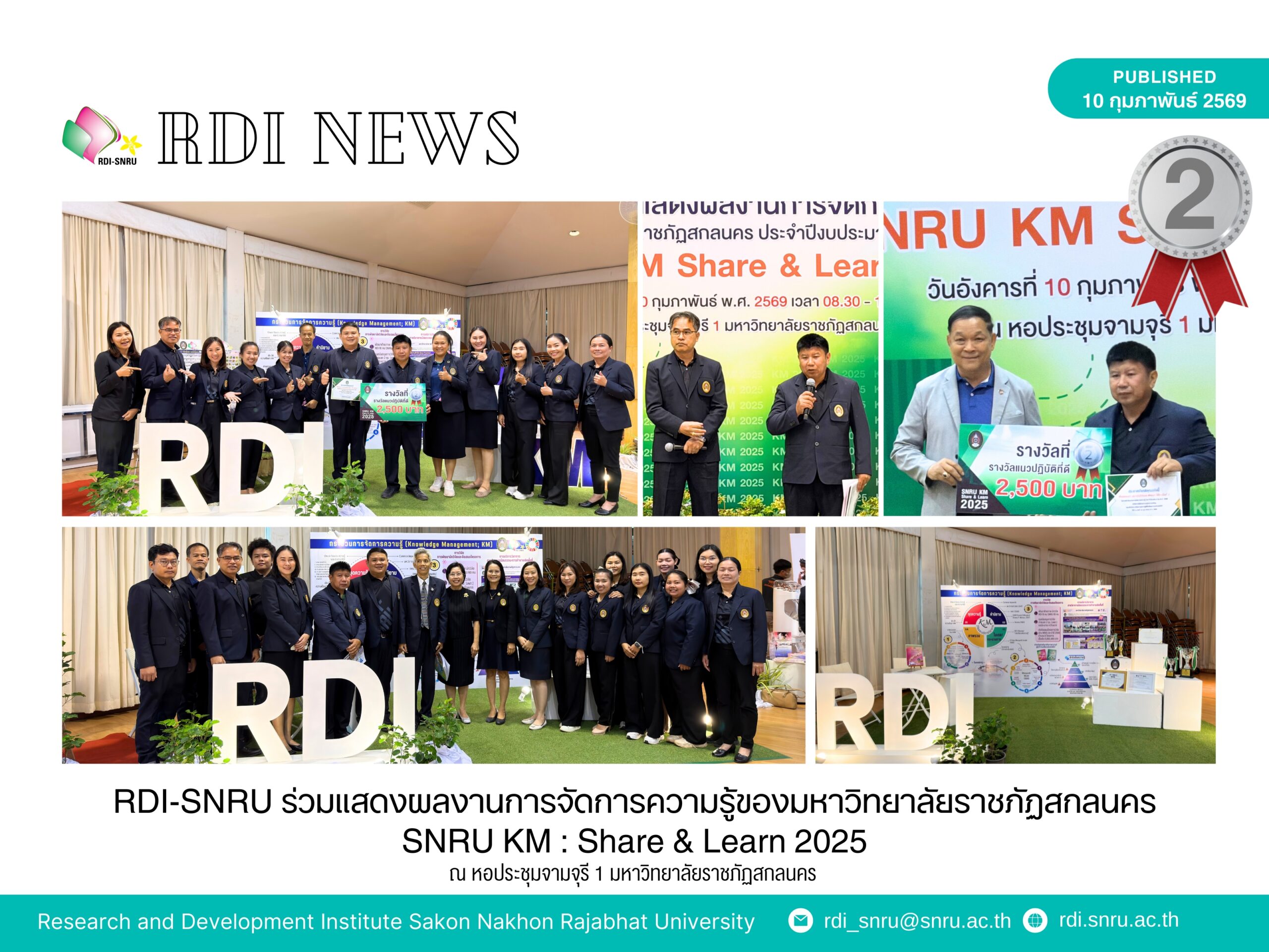เมื่อวันที่ 10 กุมภาพันธ์ 2569 สถาบันวิจัยและพัฒนา มหาวิทยาลัยราชภัฏสกลนคร (RDI-SNRU) ได้นำองค์ความรู้จากกระบวนการจัดการความรู้ (Knowledge Management: KM) เข้าร่วมจัดแสดงนิทรรศการภายในงาน SNRU KM Share & Learn 2025 ณ หอประชุมจามจุรี 1 มหาวิทยาลัยราชภัฏสกลนคร โดยนำเสนอองค์ความรู้จำนวน 2 เรื่อง ได้แก่