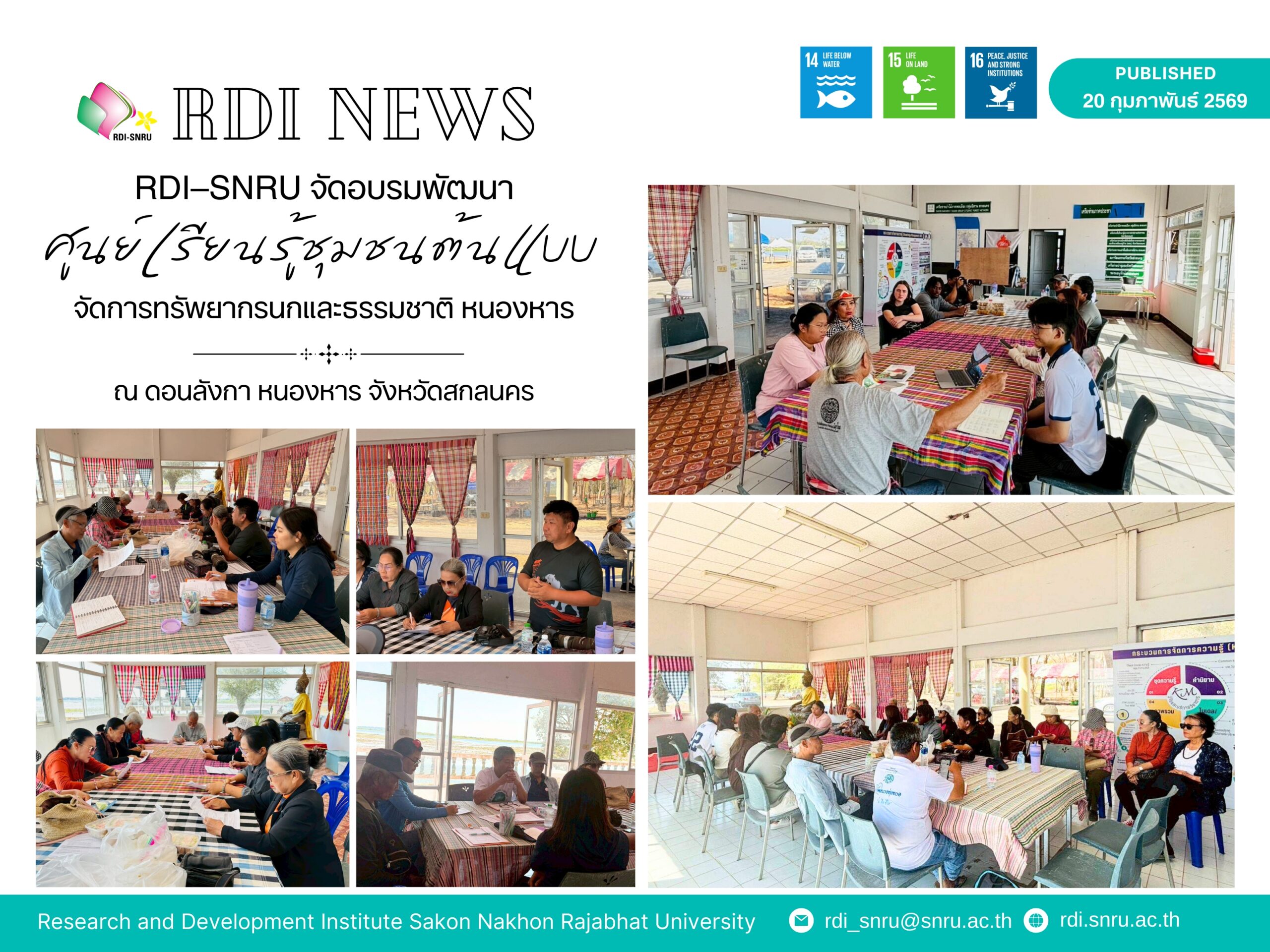 สถาบันวิจัยและพัฒนา มหาวิทยาลัยราชภัฏสกลนคร ดำเนินโครงการพัฒนาศูนย์การเรียนรู้ชุมชนต้นแบบการจัดการทรัพยากรนกและธรรมชาติโดยชุมชน ภายใต้กิจกรรมวันพื้นที่ชุ่มน้ำโลก โดยเมื่อวันที่ 16 กุมภาพันธ์ 2569 ได้จัดอบรมเชิงปฏิบัติการ ณ พื้นที่ดอนลังกา หนองหาร จังหวัดสกลนคร เพื่อเสริมศักยภาพชุมชนและภาคีเครือข่ายในการอนุรักษ์และฟื้นฟูระบบนิเวศอย่างยั่งยืน