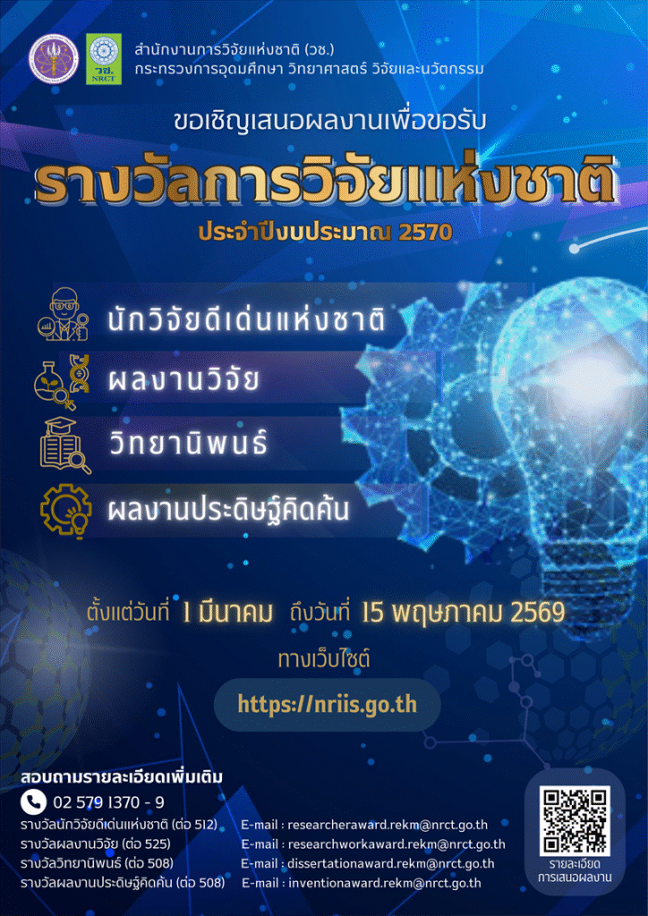 สำนักงานการวิจัยแห่งชาติ (วช.)ขอเชิญนักวิจัย นักประดิษฐ์ และบุคคลทั่วไปเสนอผลงานเพื่อขอรับรางวัลการวิจัยแห่งชาติ ปีงบประมาณ 2570