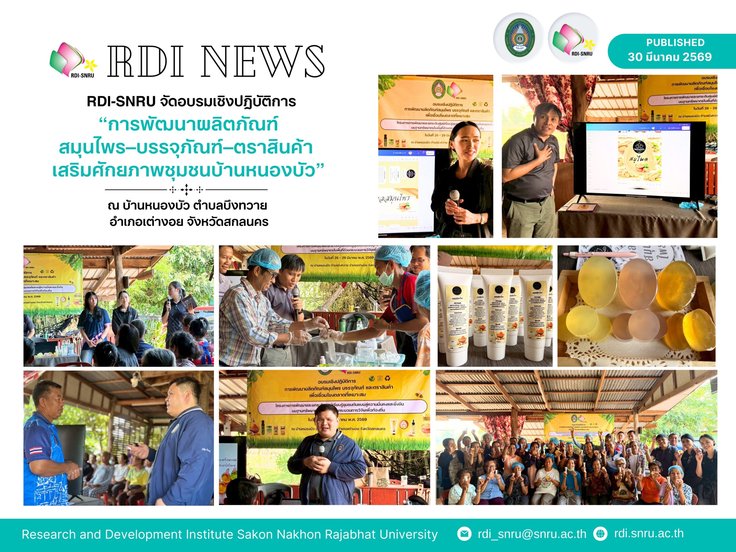 วันที่ 28 – 29 มีนาคม พ.ศ. 2569 ณ บ้านหนองบัว ตำบลบึงทวาย อำเภอเต่างอย จังหวัดสกลนครได้มีการจัดกิจกรรมอบรมเชิงปฏิบัติการ การพัฒนาผลิตภัณฑ์สมุนไพร บรรจุภัณฑ์ และตราสินค้าเพื่อเชื่อมโยงตลาดที่เหมาะสม ภายใต้ โครงการการพัฒนาและยกระดับศูนย์เรียนรู้ชุมชนต้นแบบสู่ความมั่นคงและยั่งยืนบนฐานทรัพยากรในพื้นที่ด้วยกระบวนการวิจัยเพื่อท้องถิ่น
