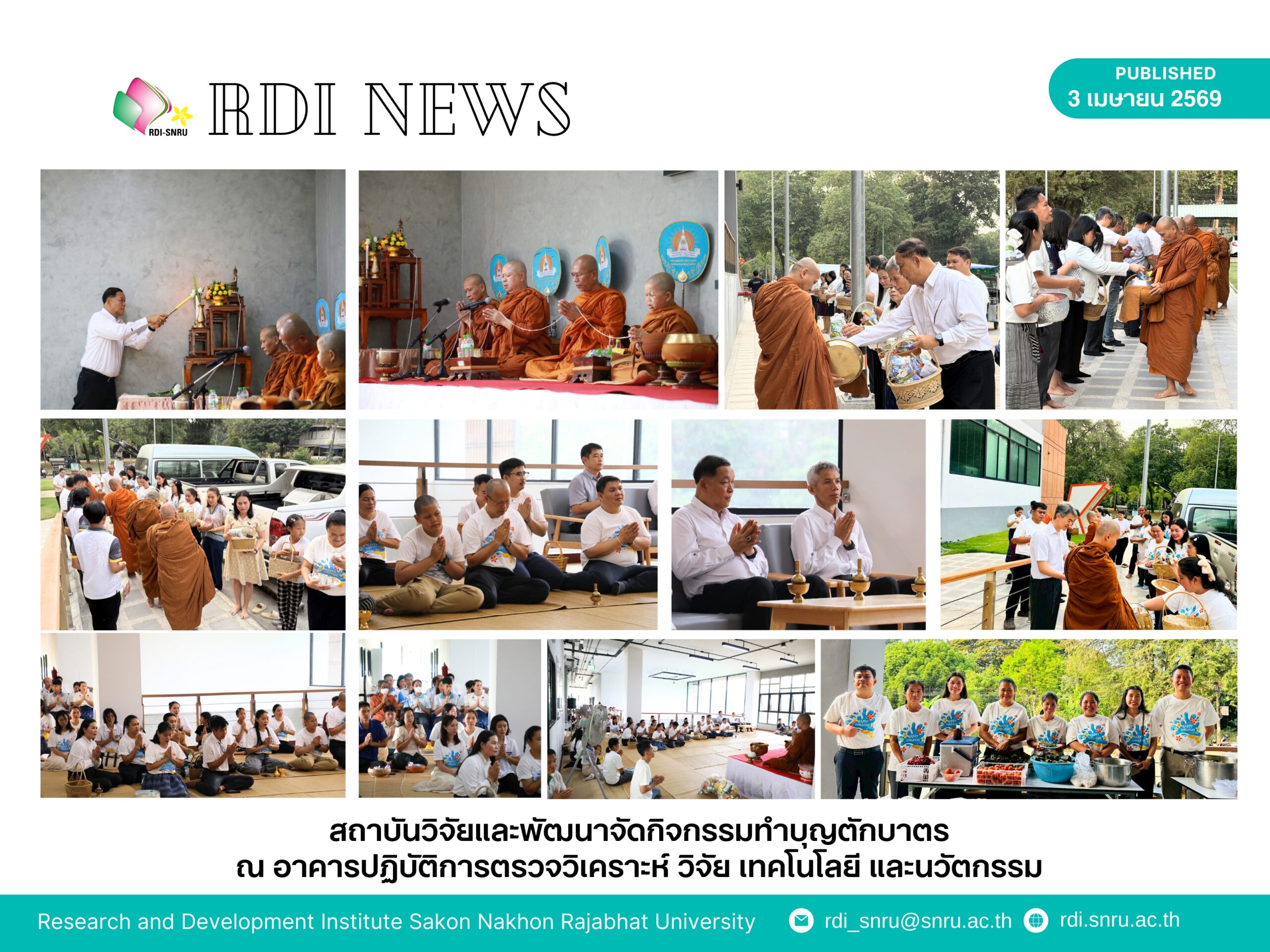 วันที่ 3 เมษายน พ.ศ. 2569 สถาบันวิจัยและพัฒนา มหาวิทยาลัยราชภัฏสกลนคร จัดกิจกรรม ทำบุญตักบาตร ณ อาคารปฏิบัติการตรวจวิเคราะห์ วิจัย เทคโนโลยี และนวัตกรรม