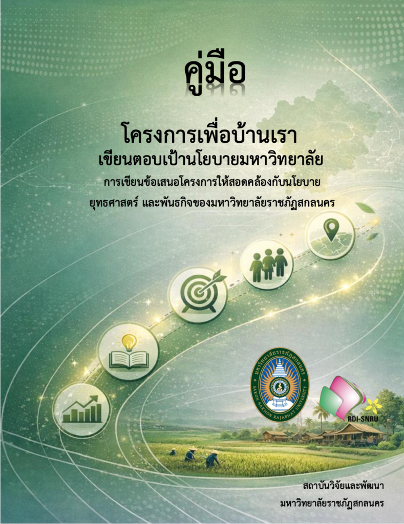 คู่มือฉบับนี้จัดทำโดยสถาบันวิจัยและพัฒนา มหาวิทยาลัยราชภัฏสกลนคร เพื่อเป็นแนวทางการเขียนข้อเสนอโครงการบริการวิชาการให้สอดคล้องกับนโยบายและยุทธศาสตร์มหาวิทยาลัย ภายใต้แนวคิด “โครงการเพื่อบ้านเรา เขียนตอบเป้านโยบายมหาวิทยาลัย” มุ่งสู่การเป็นมหาวิทยาลัยเพื่อการพัฒนาท้องถิ่น