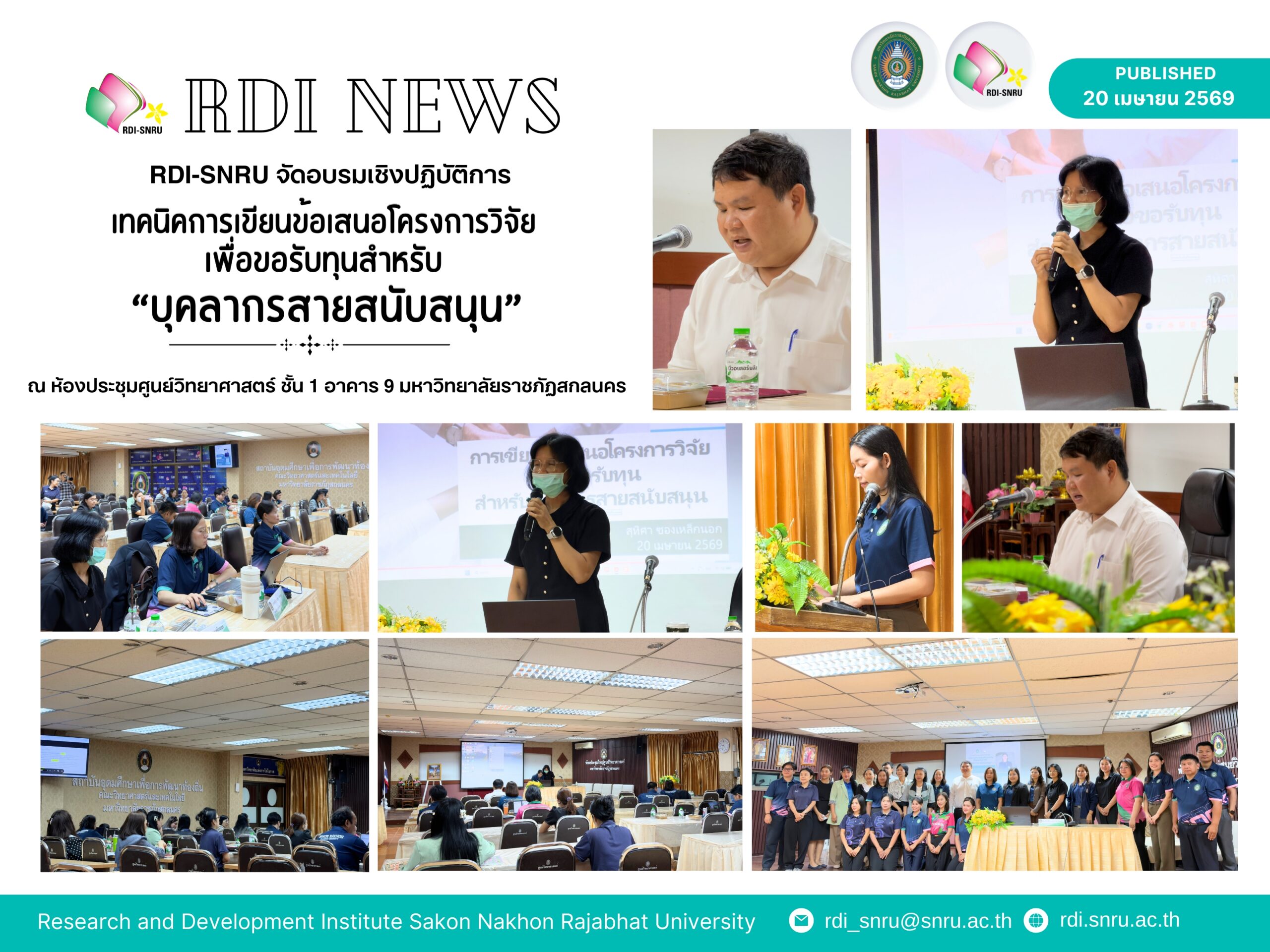 วันที่ 20 เมษายน พ.ศ. 2569 สถาบันวิจัยและพัฒนา มหาวิทยาลัยราชภัฏสกลนคร จัดอบรมเชิงปฏิบัติการหัวข้อ “เทคนิคการเขียนข้อเสนอโครงการวิจัยเพื่อขอรับทุนสำหรับบุคลากรสายสนับสนุน” ณ ห้องประชุมใหญ่ศูนย์วิทยาศาสตร์ ชั้น 1 อาคาร 9